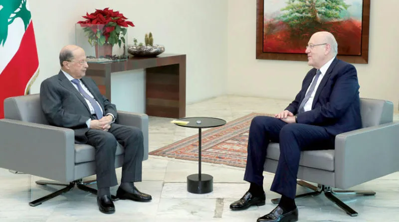 الرئيسان ميشال عون ونجيب ميقاتي خلال اجتماعهما أمس، في إطار المشاورات التي يجريها عون مع رؤساء الكتل النيابية تحضيراً لمؤتمر الحوار الوطني الذي ينوي الدعوة إليه. (دالاتي ونهرا)