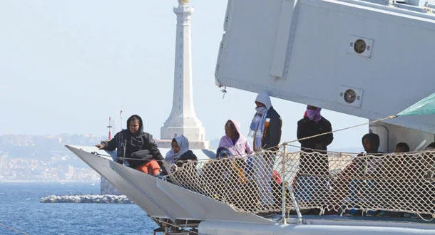 وصول مهاجرين إلى ميناء ميسينا في جزيرة صقلية الإيطالية بعد عملية إنقاذ أمس (أ.ف.ب)