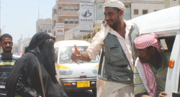 يمنية حامل في شهرها الثامن، مؤيدة للحراك الجنوبي في اليمن تحمل بندقية في منطقة الشيخ عثمان في مدينة عدن أمس (أ.ف.ب)
