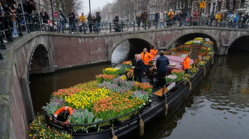 في اليوم الذي فتحت فيه المحلات التجارية أبوابها في العاصمة الهولندية أمستردام بعد أسابيع من الإغلاق بسبب وباء كورونا، قام عدد من مزارعي الخزامى بتوزيع كميات منها مجاناً على المارة عبر القنوات المنتشرة في أنحاء المدينة (أ.ب)