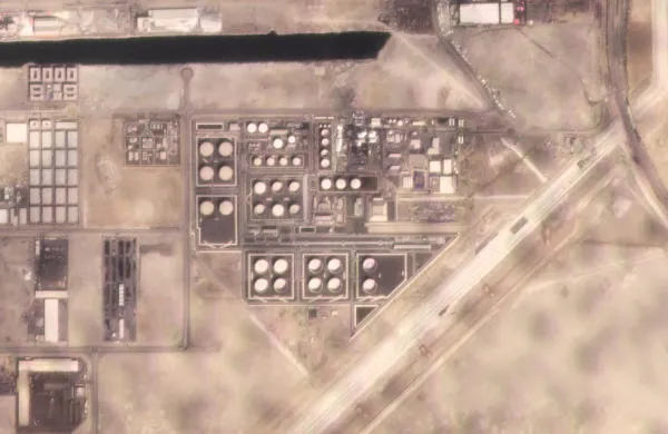 صورة بالقمر الصناعي تظهر الضرر بمنشأة تابعة لأدنوك بمنطقة المصفح الصناعية في أبوظبي (أ.ب)