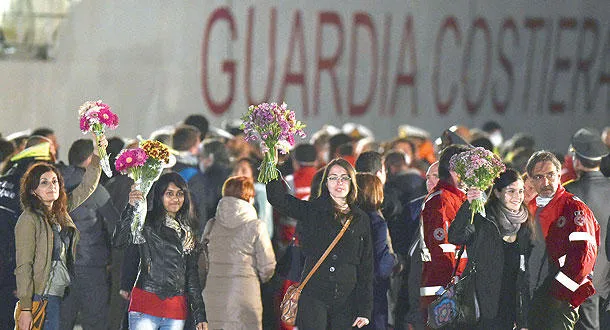 ناشطون يحملون باقات من الزهور لدى استقبال مهاجرين أنقذتهم سفن خفر السواحل الإيطالية مساء أول من أمس (أ.ب)