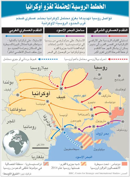 ويوضح الإنفوغراف التالي سيناريوهات محتملة للغزو الروسي لأوكرانيا: