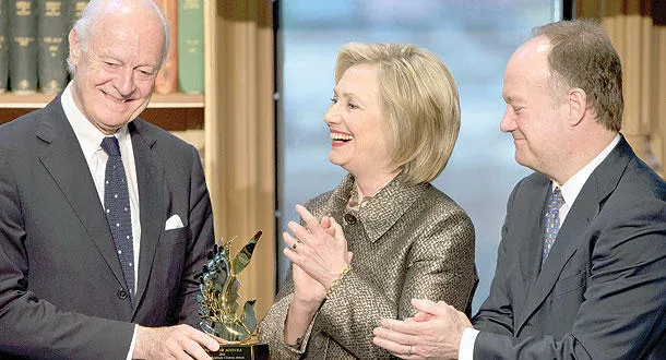 مبعوث الأمم المتحدة السابق إلى أفغانستان ومبعوثها الحالي إلى سوريا ستيفان دي ميستورا يتسلم جائزة هيلاري كلينتون لتقدم المرأة في عملية السلام كونه ساهم في دعم المرأة الأفغانية ويبدو من اليمين رئيس جامعة جورج تاون حيث أقيم الاحتفال (أ.ب)