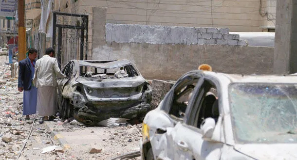 يمنيان يتفقدان سيارات تعرضت للتفجير بعد قصف قوات التحالف لمخازن تابعة للحوثيين (أ.ب)