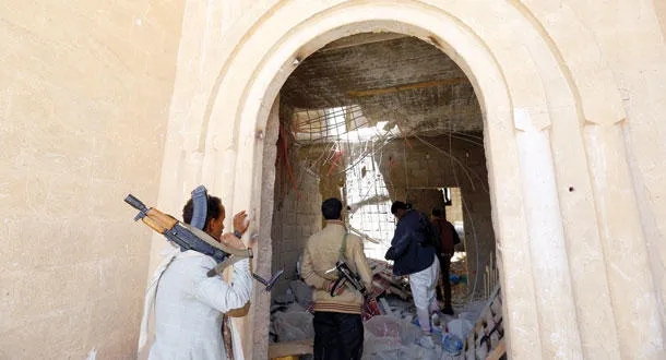 مقاتلون يمنيون يتفقدون موقعا تابعا للمتمردين الحوثيين بعد أن قصفه طيران التحالف في صنعاء أمس (إ.ب.أ)