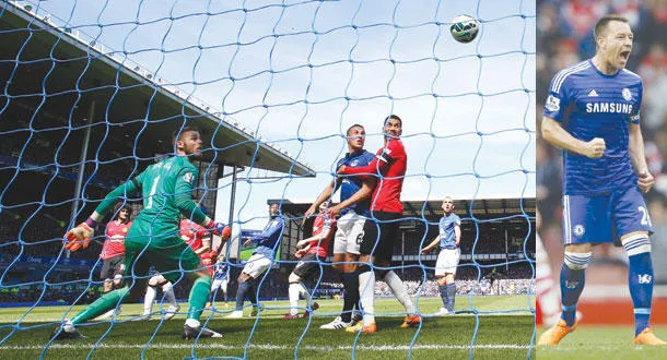 جون تيري قائد تشيلسي يعرب عن فرحته بالتعادل مع آرسنال (أ.ف.ب) - الكرة التي سددها ستونز لاعب إيفرتون من ضربة رأس في طريقها لشباك يونايتد بعد فشل الدفاع في إبعادها (رويترز)