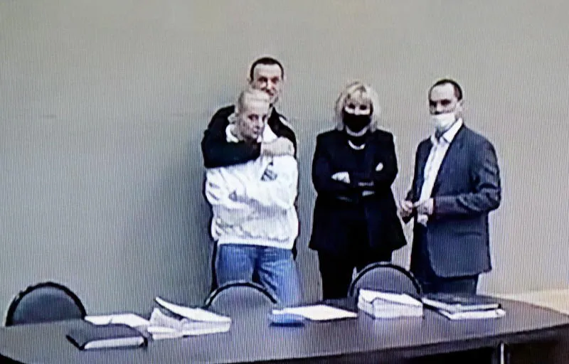 وظهر نافالني في اتصال فيديو بلباس السجن خلال الجلسة، من سجنه الواقع على مسافة 100 كلم من موسكو، الى جانب محاميه ومحاطا بعدة حراس. وعانق زوجته يوليا نافالنايا وقام بتقبيلها عدة مرات وهو مبتسم، خلال توقف تقني فور بدء المحكمة بسبب مشكلة في الصوت.