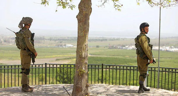 جنديان إسرائيليان قرب مدينة القنيطرة على الحدود السورية بعد سقوط قذيفتين من الحرب الدائرة في الجوار (أ.ف.ب)