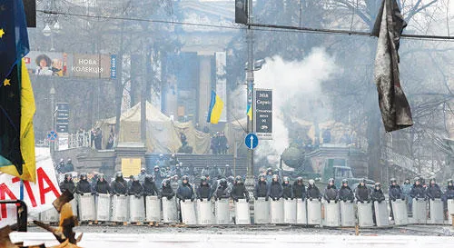 عناصر من قوة مكافحة الشغب في حالة تأهب لأي مظاهرات احتجاجية في العاصمة كييف أمس (أ.ب)