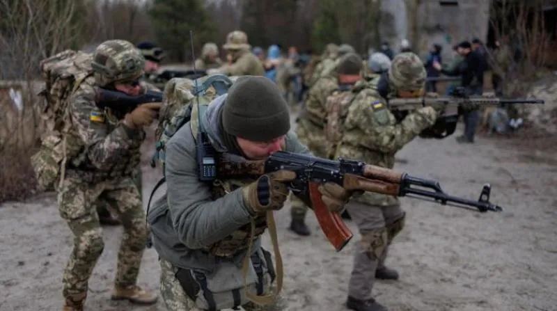 جنود احتياط يشاركون في تدريبات قتالية أجراها الدفاع الإقليمي للعاصمة في كييف (رويترز)