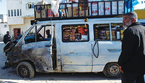 فلسطيني يقف قرب سيارة تعرضت لأضرار بعد غارة إسرائيلية على قطاع غزة أمس (أ.ف.ب)