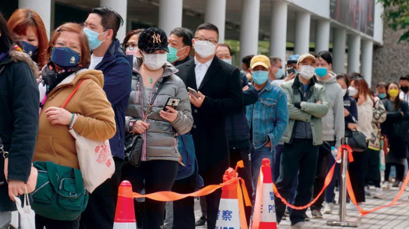 مواطنون في هونغ كونغ ينتظرون الحصول على فحص كورونا أمس (أ.ب)