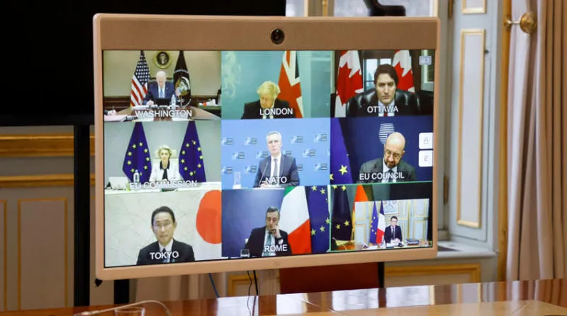 اجتماع ماكرون في الإليزيه مع قادة (G7) أمس حول الأزمة الأوكرانية (أ.ف.ب)