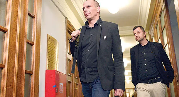 وزير المالية اليوناني المثير للجدل يانيس فاروكيس يصل إلى اجتماع وزاري في البرلمان اليوناني أمس وقد تم استبعاده من الفريق المفاوض لليونان مع الدائنين بينما حذر المسؤولون من نفاد الوقت للتوصل إلى اتفاق (أ.ف.ب)