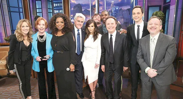 جاي لينو مقدم برنامج «تونايت شو» بين ضيوف حلقته الأخيرة بعد 22 عاما من العمل الناجح (رويترز)