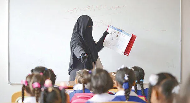 معلمة ليبية تلقي أول دروسها أمام تلاميذها بعد إغلاق مدرستها في بنغازي لنحو عام بسبب الاشتباكات بين الميليشيات (رويترز)