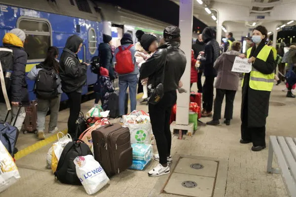 لاجئون من أوكرانيا لحظة وصولهم إلى العاصمة البولندية وارسو (إ.ب.أ)