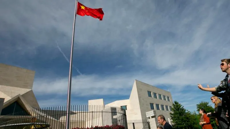أشخاص يقفون خارج مقر السفارة الصينية في واشنطن (رويترز)