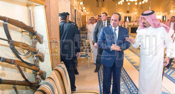 الملك سلمان بن عبد العزيز في جولة مع الرئيس المصري عبد الفتاح السيسي بقصر العوجا بمحافظة الدرعية، أمس، حيث بحثا أوضاع اليمن .. وفي الصورة الثانية وهو يودعه (تصوير: بندر الجلعود)