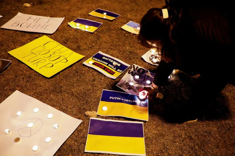 فرد يضيء شمعة خلال احتجاج تضامناً مع الشعب الأوكراني أمام السفارة الروسية في ألبانيا (رويتر)