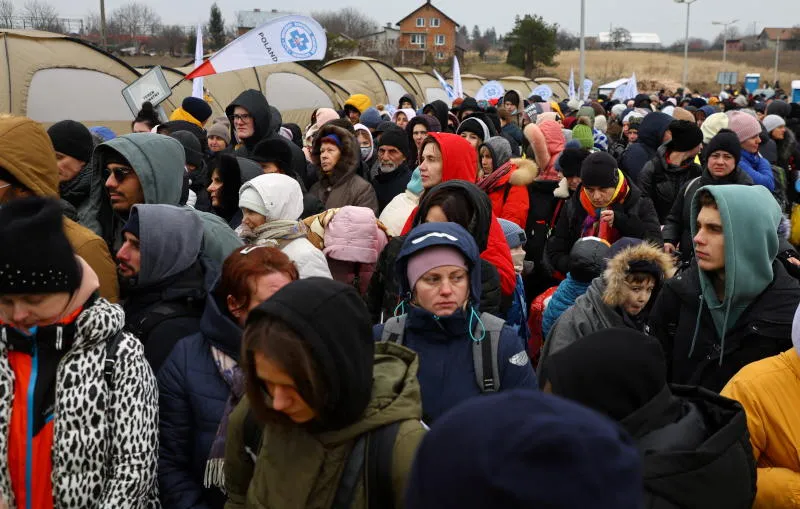 أوكرانيون ينتظرون ركوب حافلة بعد عبورهم الحدود من أوكرانيا إلى بولندا عند نقطة التفتيش الحدودية في ميديكا (رويترز)