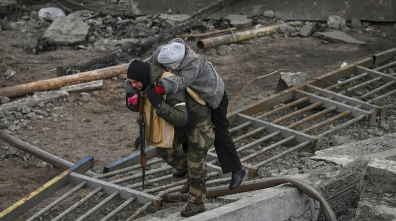 جندي أوكراني يساعد مسنة على مغادرة بلدة إيربن غرب كييف أمس (أ.ف.ب)