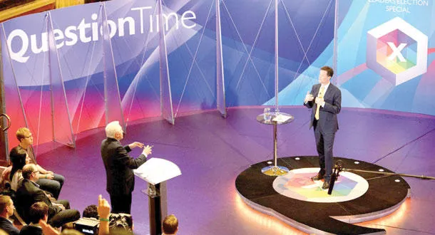 كليغ (يمين) أثناء مشاركته في برنامج «ساعة المساءلة» مع مذيع «بي بي سي» ديفيد دمبلبي بشأن الانتخابات الخميس الماضي (أ.ب)