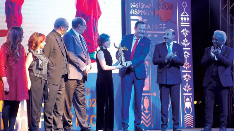 دارين سلّام خلال تسلمها الجوائز بحفل ختام «أسوان السينمائي» (الشرق الأوسط)