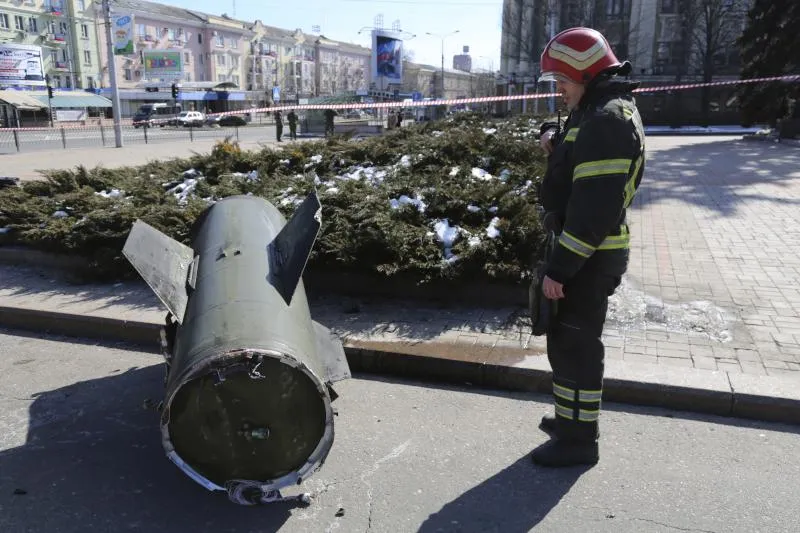 إطفائي يعاين بقايا صاروخ أوكراني من طراز «توشكا» سقط في دونيتسك (أ.ب)