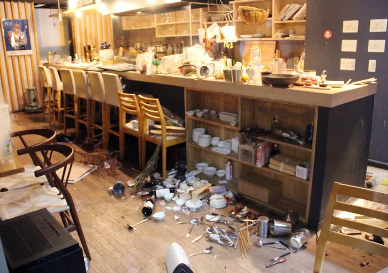 آثار الزلزال كما تبدو داخل أحد المطاعم في فوكوشيما (إ.ب.أ)