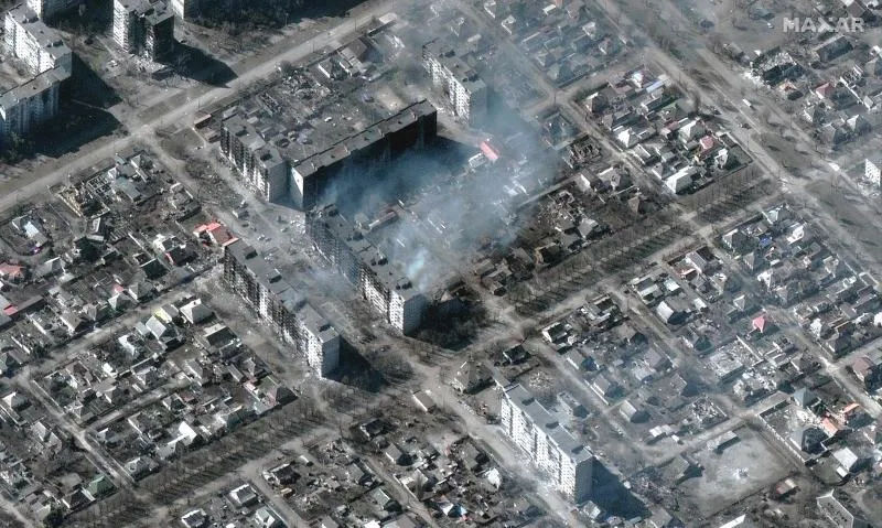 صورة من قمر صناعي لمبانٍ سكنية محترقة ومدمرة في ماريوبول (أ.ف.ب)