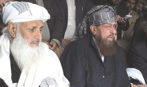 مولانا سميع الحق والبرفيسور إبراهيم خان عضوا مجلس شورى حركة طالبان خلال مؤتمر صحافي عقداه في الشريط القبلي أمس (أ.ف.ب)