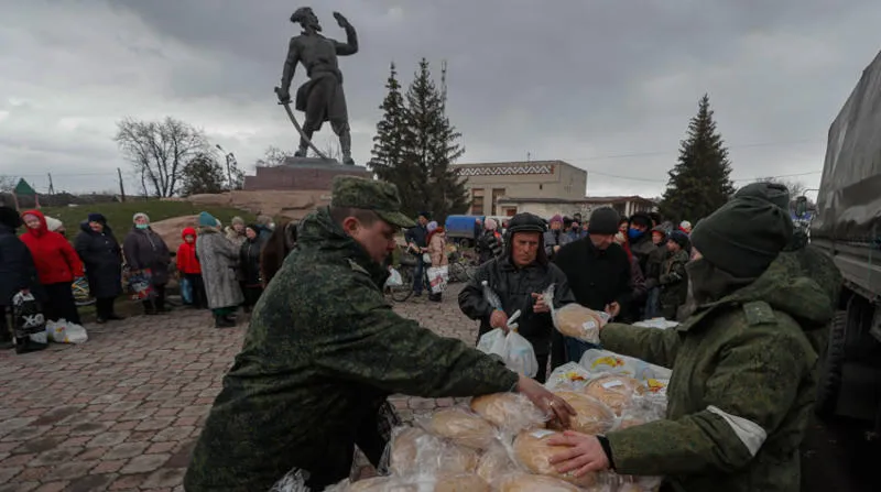 جنود روس وقوات «جمهورية لوغانسك» يوزعون مساعدات إنسانية على المدنيين أمس (إ.ب.أ)