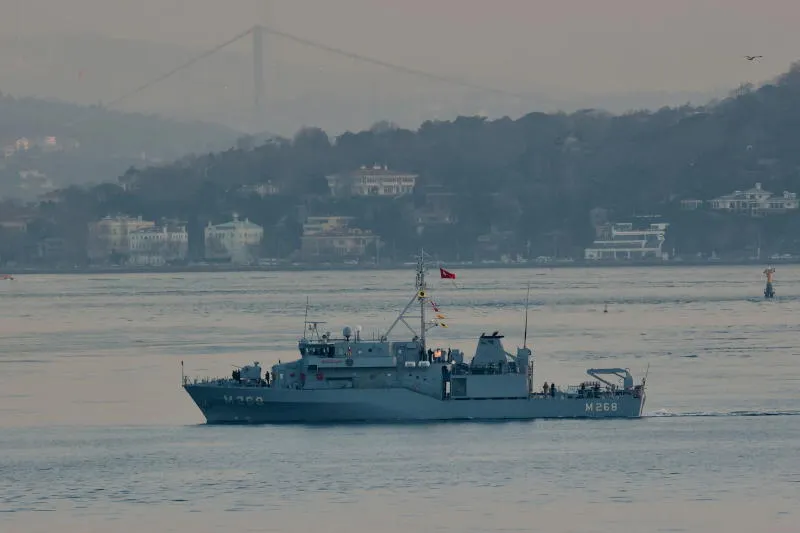 كاسحة الألغام «أكاكوكا» التركية خلال عبورها مضيق البوسفور (أ.ب)