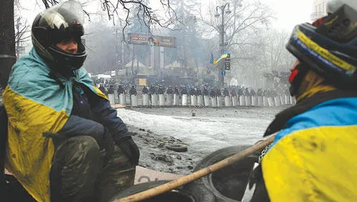 معارضان لتوجه الحكومة الأوكرانية نحو روسيا في مواجهة قوات مكافحة الشغب في العاصمة كييف أمس (رويترز)