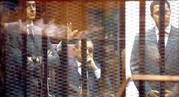 الرئيس السابق حسني مبارك يحيي مؤيديه بين ولديه علاء وجمال خلف القضبان في المحكمة الجنائية أمس (رويترز)