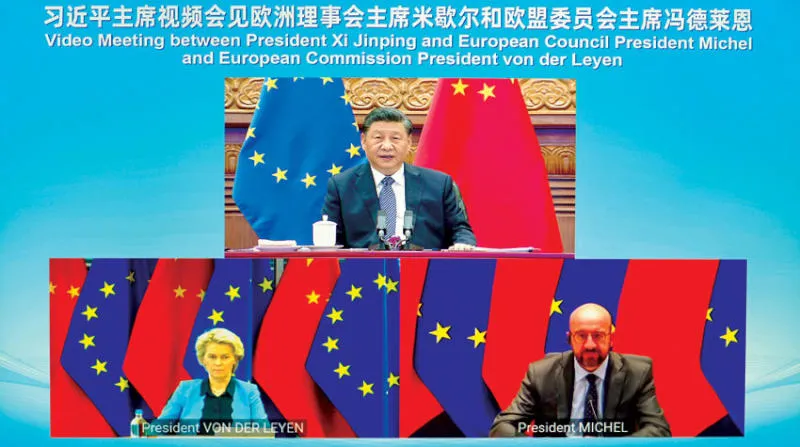 رئيسة المفوضية الأوروبية أورسولا فون دير لايين ورئيس المجلس الأوروبي شارل ميشيل خلال اجتماع الجمعة عبر الفيديو مع الرئيس الصيني شي جينبينغ (أ.ب)