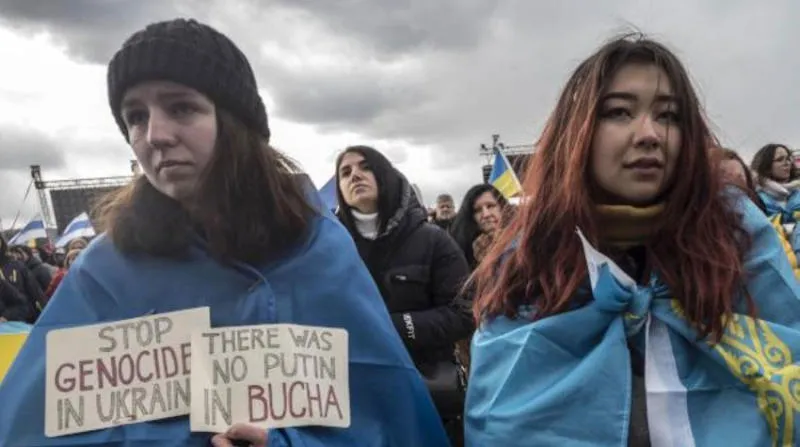 مسيرة تضامن مع أوكرانيا في براغ عاصمة جمهورية التشيك أمس (أ.ف.ب)