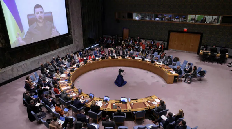 الرئيس الأوكراني فولوديمير زيلينسكي، في خطاب من كييف عبر الفيديو أمام أعضاء مجلس الأمن المجتمعين في نيويورك(رويترز)