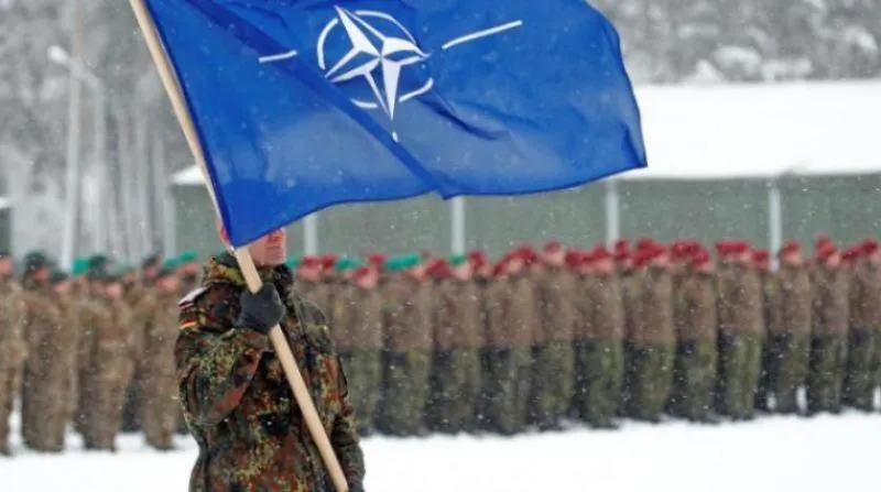 جندي يحمل علم حلف شمال الأطلسي (رويترز)