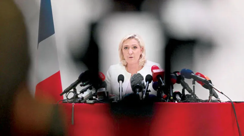 مارين لوبن خلال مؤتمر صحافي في باريس أمس (أ.ف.ب)