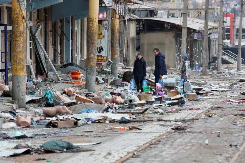 شخصان يسيران وسط الحطام في ماريوبول (أ.ف.ب)