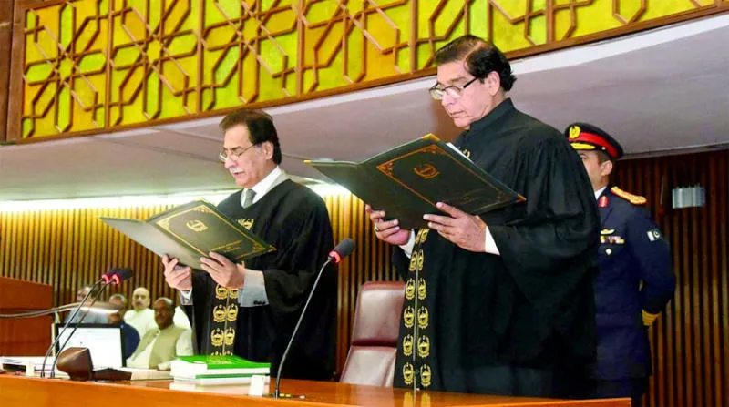 رئيس الجمعية الوطنية الجديد راجا برويز أشرف (يمين الصورة) يؤدي اليمين الدستورية بعد انتخابه أمس (رويترز)