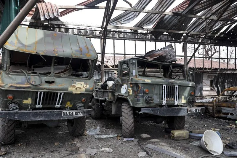 شاحنات عسكرية متضررة تابعة للجيش الأوكراني في ماريوبول (أ.ب)