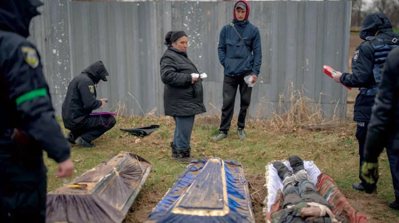 سكان قرية ميكوليتشي قرب كييف يتعرفون على بعض جثامين الضحايا (أ.ب)