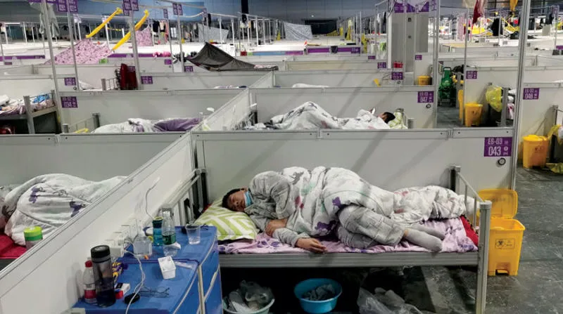مستشفى مؤقت لعلاج المصابين بفيروس كورونا في شنغهاي بالصين أمس (إ.ب.أ)