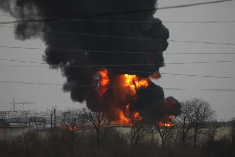 النيران تتصاعد من مستودع وقود مشتعل في مدينة بيلغورود بروسيا (رويترز)