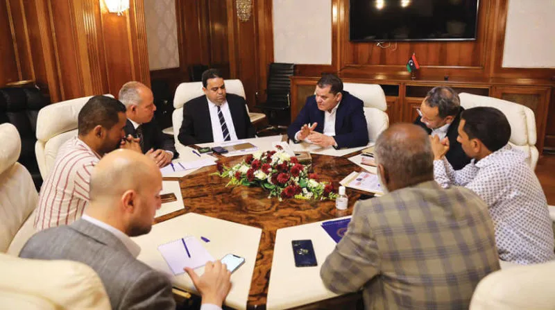 الدبيبة رئيس حكومة «الوحدة» الليبية المؤقتة مجتمعاً في طرابلس مع مجلس بلدية سبها (المكتب الإعلامي لرئيس الحكومة)