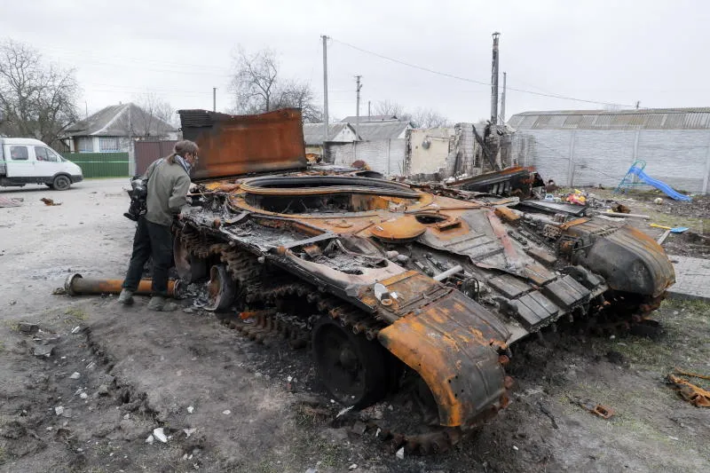 دبابة عسكرية روسية مدمرة في العاصمة الأوكرانية كييف (إ.ب.أ)